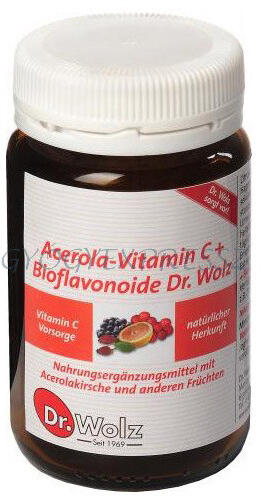 A Dr. Wolz Acerola teljesen természetes és jó minőségű C-vitamin és bioflavonoid forrás, szervezetünk frissessége és egészséges immunrendszerünk érdekében. A készítmény kiváló minőségű acerola cseresznyéből nyert C-vitamint és citrus gyümölcsökből nyert bioflavonoidokat tartalmaz. A természetes C-vitamin felszívódása, azaz hasznosulása sokkal magasabb a szinteti