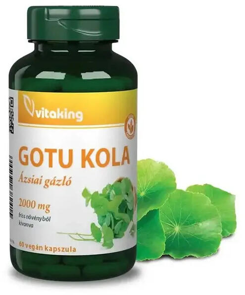 Vitaking gotu kola - ázsiai gázló Kiszerelés: 60 db vegán kapszulaA specifikációban szereplő adatok a napi adagra (1 kapszula) vonatkoznak. A Gotu Kola, más néven Ázsiai gázló, Tigrisfű egy Srí Lankán őshonos gyógynövény fajta. Fokozhatja a szellemi teljesítőképességet és a keringés működését, hozzájárulhat az emésztés egészségének fenntartásához. Kapszulánk