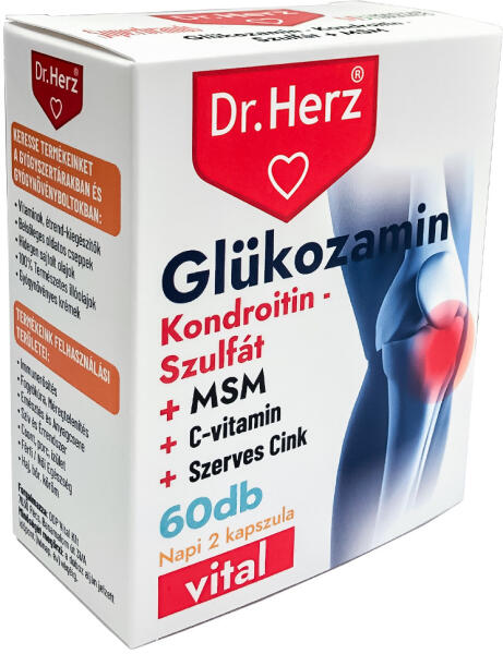 Dr. herz glükozamin+kondrotin-szulfát+msm kapszula 60 db Természetes, komplex izületi készítmény 3 kiváló, magas hatóanyag tartalmú jól felszívódó értékes tápanyaggal (Glükozamin-szulfát, MSM, Kondroitin -szulfát) hozzáadott C-vitaminnal és szerves kötésű, jó biológiai hasznosulású Cinkkel. Javasolt izületi betegség, vagy fokozott izületi terhelés következtében