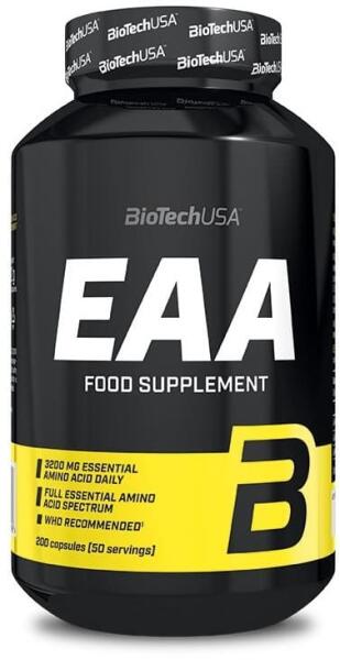 BioTech USA EAA kapszula: Esszenciális aminosav-tartalmú étrend-kiegészítő, amely támogatja az izomépítést és -megtartást. A 200 db-os kiszerelés biztosítja a szervezet számára nélkülözhetetlen aminosavakat, melyeket külső forrásból kell bevinnünk. Ideális választás sportolóknak és aktív életmódot folytatóknak.