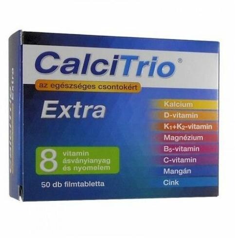 CalciTrio® Extra 50db A csontok multivitaminja A CalciTrio® Extra kalcium, D- és K2-vitamin mellett számos további hatóanyagot (magnéziumot, cinket, mangánt, K1- és C-vitamint) tartalmaz, melyek hozzájárulnak az egészséges csontozat fenntartásához. Hogyan kell szedni? Ajánlott napi mennyiség: 2 filmtabletta, melyek akár egyidejűleg is bevehetők. A filmtablettákat étkezés kö