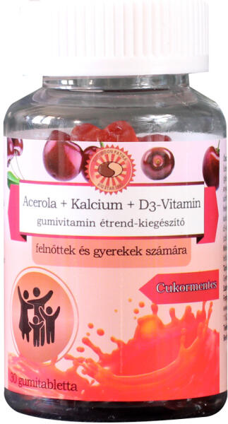 Sun Moon acerola+kalcium+d3-vitamin étrend-kiegészítő gumivitamin 30 db Cukormentes, vitaminokat tartalmazó étrend-kiegészítő gumitabletta felnőttek és gyermekek számára, acerola cseresznye ízű, cseresznye piros színű gumivitamin. Az acerola nagy mennyiségben tartalmaz C-vitamint, ezen kívül jelentős A- vitamin, thiamin, riboflavin, magnézium, kálium és vas forrás is. A ka