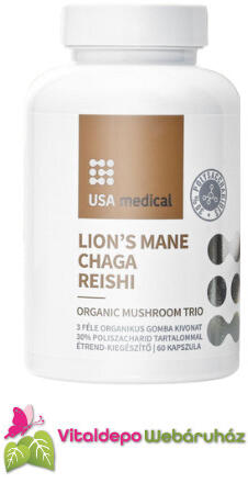 Gomba-trió: Lion’s Mane (süngomba), Chaga (hamvaskéreg gomba) és Reishi gomba (ganoderma, pecsétviaszgomba) kivonat egy kapszulában, acerola kivonattal! Az USA Medical Gomba-trió egy speciális összetételű, jelentős hatóanyag koncentrációval készült gombakivonat trió, mely egyesíti magában a kínai orvoslás tradícióit, az ősi észak-európai kultúrák megfigyeléseit, val