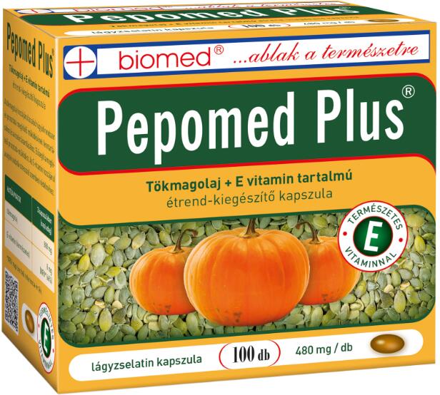 Biomed Pepomed Plus® Tökmagolaj + E vitamin tartalmú étrend-kiegészítő tisztán növényi eredetű kapszulában 100 db kapszula/dobozA tökmagolaj hozzájárulhat az alsó húgyúti rendszer és prosztata megfelelő működésének fenntartásához és a vizelet áramlásához. Elősegítheti a megfelelő prosztataműködést. Az E vitamin , mint antioxidáns, fontos szerepet játszhat a t