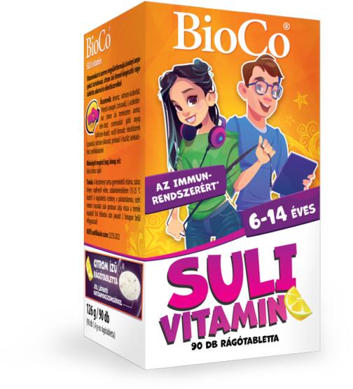 Vitaminokat és szerves vegyületformájú ásványi anyagokat tartalmazó, citrom ízű étrend-kiegészítő rágótabletta cukorral és édesítőszerekkelA BioCo® SULI vitamin iskolás korú, 6-14 éves gyermekek számára készült, természetes aromával és 6 féle hatóanyaggal. A készítmény tartalmazza a gyermekek szellemi (kognitív) képességének fejlődéséhez szükséges vasat,