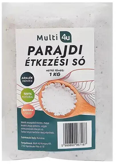 Multi 4U Parajdi só 1 kgKiszerelés: 1 kg Ismerjük meg a terméket! Adalékanyagoktól mentes, magas ásványi anyag tartalmú, vegyes szemcseméretű étkezési só. Adalékmentes 100% Natural Reform food A parajdi sóról: A parajdi sóbánya története egészen az ókorig visszavezethető: a jelenleg Románia területén található Szováta település környékén már a rómaiak is folyta