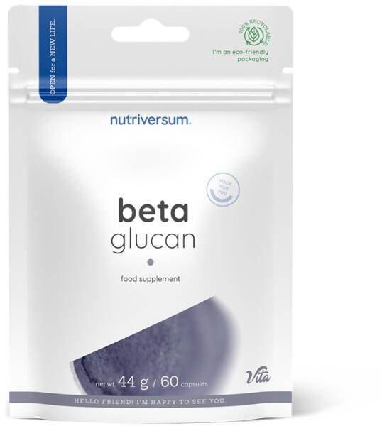 A Nutriversum Beta glucan 60 kapszula napi adagonként 700mg beta glucan-t tartalmaz. A Beta-Glucan napi adagonként 700 mg béta-glükánt tartalmaz! A béta-glükán egy a természetben is előforduló poliszacharid. Gombák, növények, baktériumok sejtfalának alkotóeleme. Természetes forrása a gabonakorpa, zabpehely, vagy az egyszerű élesztő (Saccharomyces cerevisiae) sejtfala. A béta