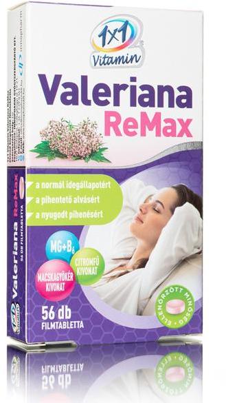 1×1 Vitamin Valeriana Remax étrend-kiegészítő filmtabletta 56 db A Valeriana officinalis (macskagyökér) hozzájárul a megfelelő idegállapot és a normál alvás fenntartásához. A citromfű hozzájárul a megfelelő pihenéshez és a nyugodt alváshoz. Az 1×1 Vitamin Valeriana Remax étrend-kiegészítő filmtabletta B6-vitamint, magnéziumot, macskagyökér -és citromfű kivonatot ta
