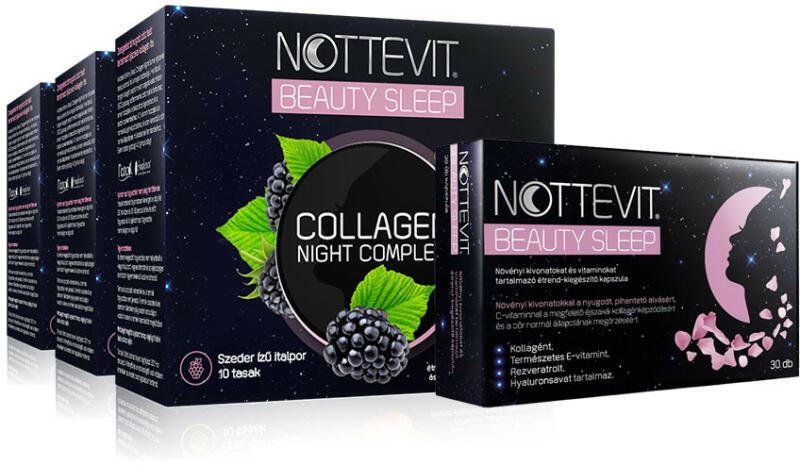 Nottevit Beauty Sleep kapszula és a Nottevit Beauty Sleep Collagen Night Complex italpor most egy csomagban a nagyobb hatás elérése érdekében. A csomag 1 hónapra elegendő, kedvezményes áron. Kiszerelés: 3x10 db + 30db Nottevit Beauty Sleep Collagen Night Complex italpor 3x10db + Nottevit Beauty Sleep 30db Nottevit Beauty Sleep kapszula és a Nottevit Beauty Sleep Collagen Night Complex