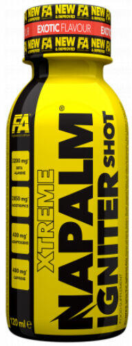 FA Xtreme Napalm Igniter Shot A FA Xtreme Napalm Igniter Shot egy edzés előtti készítmény, ami motivál, hogy elmenj az edzőterembe és megküzdj a súlyokkal. A benne levő dinitrogén-oxid aktivátor és modern serkentőszerek keveréke ellát energiával, tágítja az ereket biztosító az izmok maximális vérellátását, felgyorsítja az izomtömeg növekedését. Amennyiben hiányzik