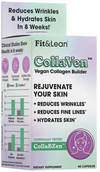 MEGFIATALÍTJA A BŐRT A CollaVen egy innovatív, vegánbarát bőrfiatalító és kollagénépítő formula. VegánA CollaVen egy innovatív, vegánbarát bőrfiatalító és kollagénépítő formula. Ez a tudományosan alátámasztott táplálékkiegészítő a Phyllanthus Emblica, Camellia Sinensis és Coffea Arabica természetes növényi összetételét, a CollaBZen-t tartalmazza. Klinikai k
