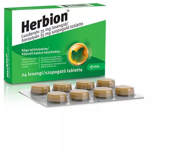 A Herbion borostyán szopogató tabletta egy növényi gyógyszer, produktív köhögés esetén köptetőként javallott. A Herbion borostyán szopogató tabletta borostyánlevél száraz kivonatát tartalmazza. A Herbion borostyán szopogató tabletta növényi gyógyszer, mely hurutos köhögés esetén köptetőként javallott felnőtteknél, serdülőknél, valamint 6 éves vagy idősebb gyer