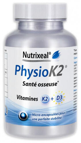 A PhysioK2® egy szabadalmaztatott K2-vitaminon (K2-MK7) és növényi D3-vitaminon alapuló bioaktív komplex, szinergista hatással. A termék nagy koncentrációjú, és mikrokapszulázott formákat tartalmaz az optimális biológiai hozzáférhetőség érdekében. Összetevők : mikrokapszulázott K2-vitamin (100% aktív forma), mikrokapszulázott D3-vitamin.