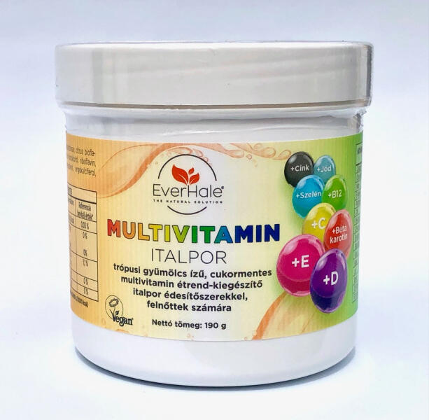 Everhale multivitamin italpor trópusi gyümölcs ízű 190 g Multivitamin italpor trópusi gyümölcs ízű Ezzel a különösen finom, trópusi gyümölcs ízű, cukornélküli italporral feltöltheti szervezetét multivitaminokkal, miközben élvezheti a kellemes trópusi ízeket és kihasználhatja a jobb felszívódás előnyeit. Tartalmazza azokat a fontos összetevőket, amikre szükség va