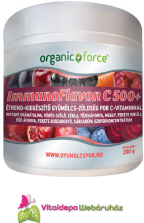 Gránátalma, vörös szőlő, cékla, tőzegáfonya, meggy, fekete ribizli, kék áfonya, fekete bodzabogyó, sárgarépa, inulin tartalmú szuperkoncentrátum por. Allergén információ: allergént nem tartalmaz. Hozzáadott cukormentes, édesítőszermentes, laktózmentes, tejtermék-mentes, gluténmentes, tartósítószer-mentes. IMMUNOFLAVON C 500+ instant gyümölcs-zöldség szuperkoncentr