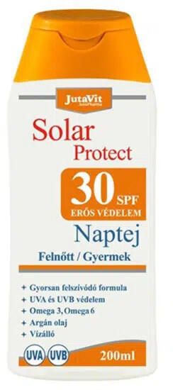 Erős (30 faktor), vízálló napvédő krém, amely segít megóvni bőrét a nap káros sugaraitól. A készítmény argánolaj tartalmának köszönhetően az UVA/UVB sugárzás védelmen túl feltölti, ápolja a bőrt. JutaVit Apotheke Solar SPF30 naptej 30 faktoros vízálló naptej, erős UVA/UVB védelemmel ellátott formula, amely nemcsak hogy véd a leégés ellen, de gyönyörű barnas