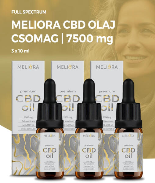 Terpénekben, flavonoidokban és kannabinoidokban gazdag kender kivonatok, összesen 7500 mg CBD tartalommal Meliora Teljes Spektrumú 25% CBD csomag 7500 mg hatóanyag-tartalommal A Meliora teljes spektrumú 25% kannabisz olaj csomag 3 x 10 ml-es kiszerelésben 7500 mg CBD-t tartalmaz , amely természetes megoldást nyújthat a mindennapi stressz kezelésére, alvásproblémákra, gyulladáscsök