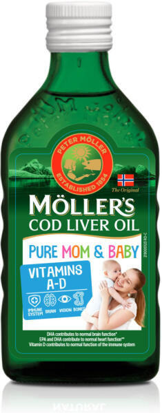 Möllers omega-3 halolaj étrend-kiegészítő a- és d-vitaminnal mom and baby 250 ml A Möller’s Baby Omega-3 tőkehalmájból készült, természetes omega-3 zsírsavakat, A- és D-vitamint tartalmaz. Tartalom | 5 ml-benD-vitamin A-vitamin Omega-3 zsírsavak – total DHA – total EPA 10 g (200%*) 250 g (31%*) 1130 mg 510 mg 370 mg Esszenciális omega-3-ban rendkívül gazdag tőkehalmájbó