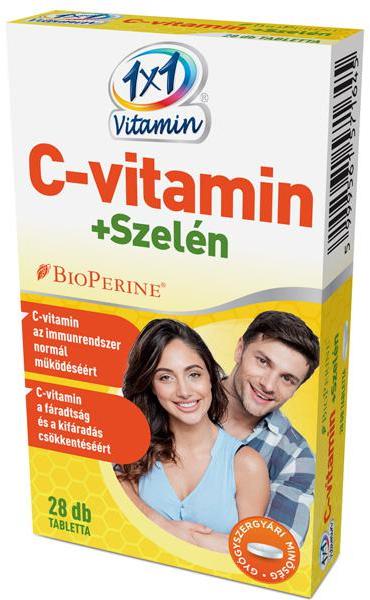 1×1 Vitamin C-vitamin + szelén étrend-kiegészítő filmtabletta BioPerine®-nel 28 db A C-vitamin és a szelén hozzájárul az immunrendszer normál működéséhez, valamint a fáradtság és a kifáradás csökkentéséhez. Az 1×1 Vitamin C-vitamin + szelén étrend-kiegészítő filmtabletta 200 mg C-vitamint tartalmazó készítmény. Napi 1 tabletta fogyasztása javasolt. Az étrend-kie