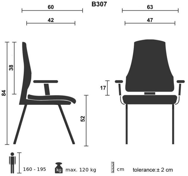 Látogatói szék Magasság min. : 84cm max. : 84cm Mélység min. : 60cm max. : 60cm Szélesség min. : 63cm max. : 63cm Ülés mélysége min. : 42cm max. : 42cm Ülés szélessége min. : 63cm max. : 63cm Háttámla magassága az üléstől min. : 38cm max. : 38cm Háttámla szélessége min. : 47cm max. : 47cm Karfa magassága a padlótól min. : 52cm max. : 52cm Szivacs: 5 cm vastag, 32 DNS v