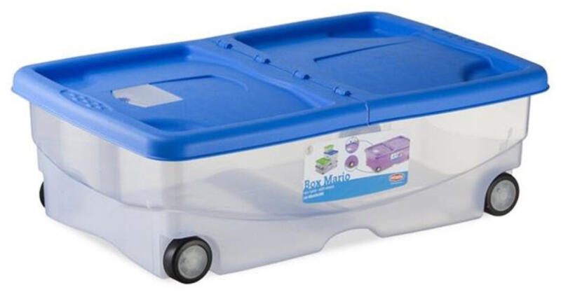 Stefanplast praktikus műanyagdoboz táp vagy alom tárolására, négy darab kerékkel és összecsukható kék fedéllel.