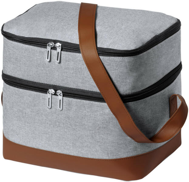 RPET hűtőtáska PEVA párnázással, cipzáras rekeszekkel, műbőr borítású vállpánttal és aljjal. 600D RPET poliészter, megkülönböztető RPET címkével. Anyaga: 600D újrahasznosított PET poliészter / Alumínium / Műbőr / Fém Mérete: 300×260×200 mm .