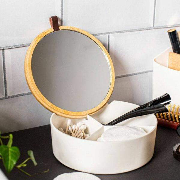 Egy megoldás a rendezett térhez a fürdőszobába. A 3 rekeszes tárolódobozban elhelyezheted a fontosabb dolgokat a sminkeléshez (sminkvatta, fültisztítópálca, hajgumi, hajcsat. Különlegessége a bambusz fedelén rejtőző tükör, mely praktikusan kitámasztható a dobozra. Helyezd el a fürdőszobai polcon, komódon. Anyaga: műanyag, bambusz. Színe: fehér, fa. Mérete: 14x5 cm. Ez