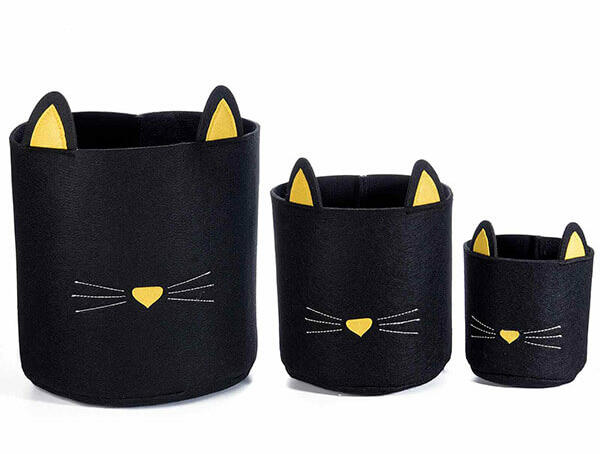 Desing tárolókosár nemcsak macska rajongóknak! 3 különböző méretű, különleges fekete cicás mintázatú tárolókosár, mely mutatós és praktikus tárolóként használható a lakásban. Használható takarók, ruhák, játékok és egyéb dolgok tárolására. Méretek: nagy átmérője 28 cm, magassága 30 cm (füllel 35,4 cm), közepes átmérője 20 cm, magassága 22 cm (füllel