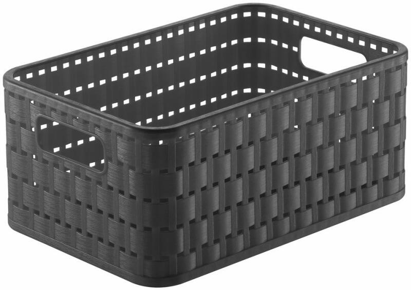 A rattan szövés stílusú műanyag tárolódoboz modern dizájnja és minőségi kialakítása széles körű felhasználási lehetőséget kínál az egész otthonban. Praktikus fogantyúk a könnyű hordozhatóságért. Termék részletek: méretek: 23,7 x 15,8 x 10,8 cm (H x Sz x Ma) anyaga: műanyag szín: antracit súlya : 0,16 kg űrtartalom: 4 l Csomag tartalma: 1 x tároló doboz