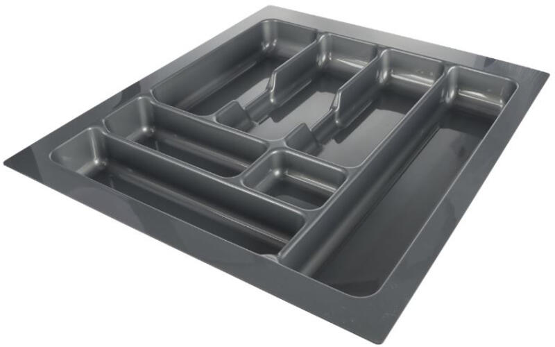 Műanyag evőeszköztartó felső fiókókhoz. Könnyen méretre vágható éles késsel vagy fűrésszel. A mélységi méret megfelelő a legtöbb 500 mm hosszú fióksínhez.