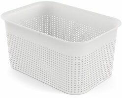 Tárolódoboz perforált szerkezettel. Újrahasznosított műanyagból készült. Egyszerű és modern dizájn. Lekerekített sarok. Űrtartalom: 4,5L. Minőségi anyagok és dizájn a svájci Rotho márkától. Termék részletek: A termék méretei: 26,2 x 18 x 13 cm (H x Sz x Ma) anya ga: műanyag fehér szín ű rtartalom: 4,5 l egysze rű és modern design m inőségi anyag és design t eljes
