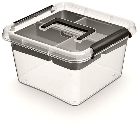 Praktikus kiemelhető osztott betéttel rendszerező doboz otthonába. Bárhol hasznos tárolóeszköz. Fürdőszobában, szekrényben, gyerekszobában, vagy akár garázsban is remekül használható apróbb tárgyak rendszerezésre. Erős, tartós műanyagból készült. Mérete: 29x16,5x29 cm. Űrtartalma: 9 liter.