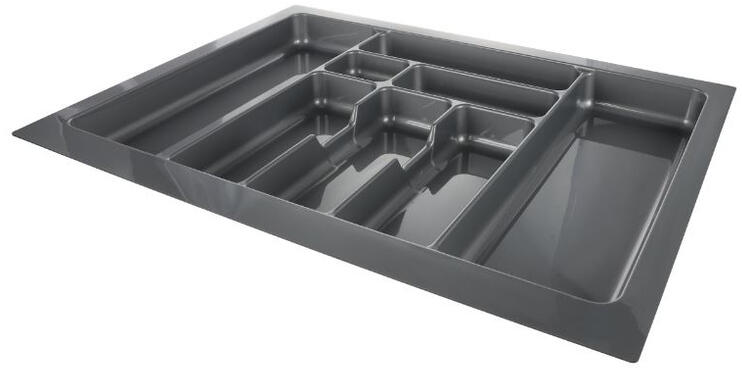 Műanyag evőeszköztartó felső fiókókhoz. Könnyen méretre vágható éles késsel vagy fűrésszel. A mélységi méret megfelelő a legtöbb 500 mm hosszú fióksínhez.