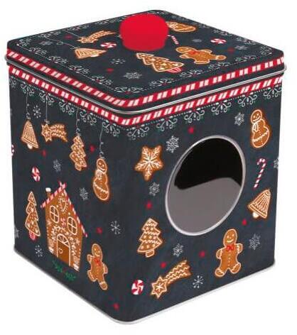 Stílusos mézeskalács mintájú különleges fémdoboz elején kis ablakkal, így bele látni, hogy milyen finom sütemény rejtőzik benne. Teteje könnyedén leemelhető. Karácsonyi fémdoboz mérete: 14,5x13x13 cm. Színvilág: fekete, arany mézeskalács szín.