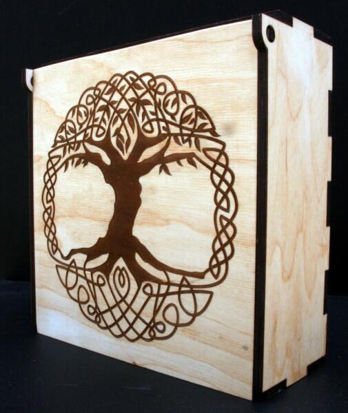 Az Ajándékdoboz fa mintával kiváló ajándék lehet barátoknak, családtagoknak vagy kollégáknak. A fa rétegelt nyír lemezből készült doboz mérete 9x21x21 cm és vastagsága 6 mm. A doboz tetején életfa minta található, mely különlegessé teszi az ajándékot. A belseje lehet 9 fakkos, de igény szerint fakk nélkül is rendelhető. A termék egyediségét a lézergravírozott f