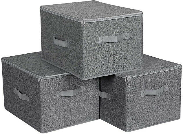 3 darabos tároló doboz készlet, univerzális, 30 x 40 x 25 cm-es méretének köszönhetően a legtöbb szekrény vagy tároló polc belső részében elhelyezhető. A dobozok anyaga masszív 2 mm vastag rost lemez, vászon borítással és zipzáros zárható fedéllel, amelyek 5 kg teherbírással rendelkeznek. Használaton kívül kis helyen elférnek összehajtott állapotban. Szélesség: