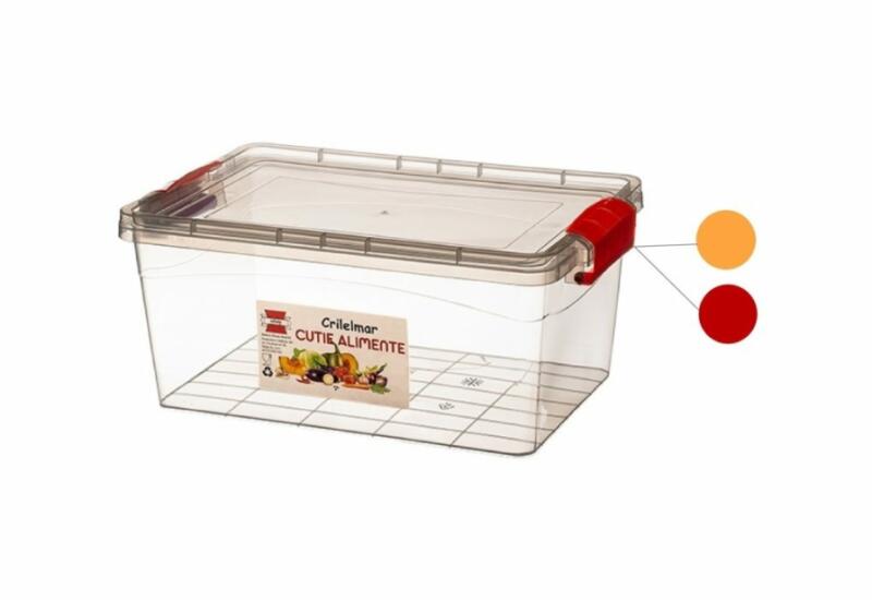5 literes, szögletes műanyag tároló doboz, csatos zárófedővel. Méret: 30,5x19,5x13 cm.