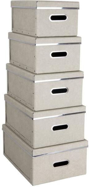 - A készlet 5 db különböző méretű dobozt tartalmaz: XS (20,5 x 31,5 x 15 cm); S (22,5 x 33,5 x 15,5 cm); M (24,5 x 35,5 x 16 cm); L (26,5 x 37,5 x 16,5 cm) és XL (28,5 x 39,5 x 17 cm). - Az alsó rész strapabíró farostlemezből készült, amelyet újrahasznosítási folyamat során nyernek. A fennmaradó elemek fenntartható gyártási eljárással előállított papírból készülnek.