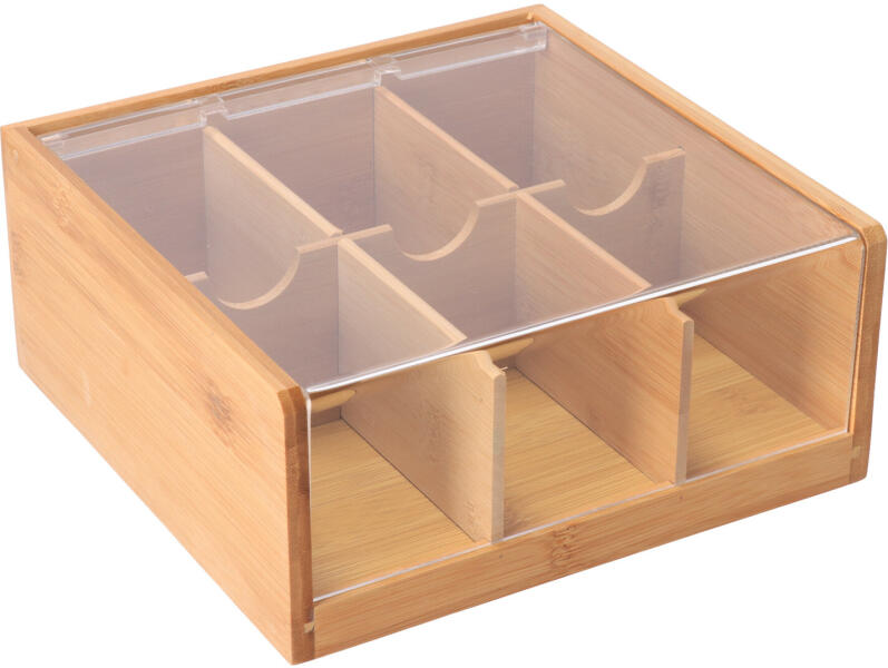 A hat rekeszes bambusz teadoboz a teafilterek tárolására szolgál. A műanyag fedélnek köszönhetően a tea sokáig megőrzi finom illatát. A tea (kiejtése a kínai 茶 - cscha -ból ered) a benne lévő anyagoknak köszönhetően jótékony hatással van az emberi szervezetre. Télen a csészét szívesen fogyasztja felmelegítve, nyáron pedig a jeges változatban. A rekesz mérete 9,5 x
