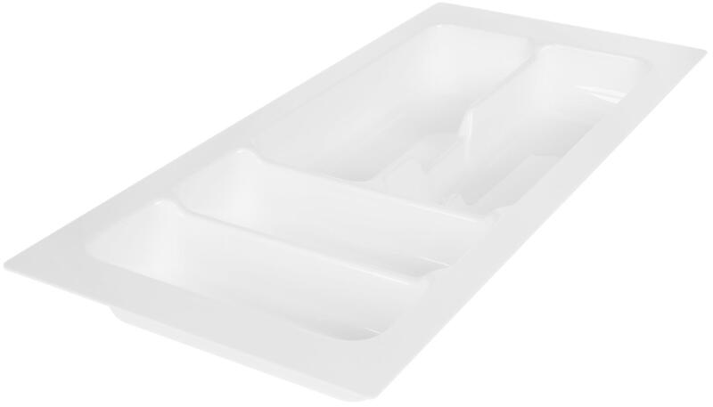 Műanyag evőeszköztartó felső fiókókhoz. Könnyen méretre vágható éles késsel vagy fűrésszel. A mélységi méret megfelelő a legtöbb 500 mm hosszú fióksínhez.