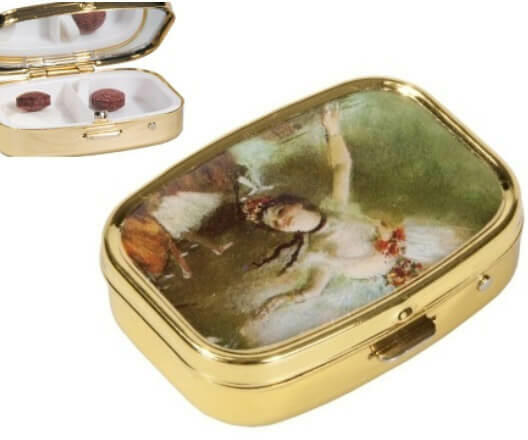 Degas The Star - Ballerinás képével díszített gyógyszertartó fémdoboz. Kettes osztású / két fakkos. Mérete: 5,1x1,8x3,6 cm. Praktikus ajándék hölgyek részére.