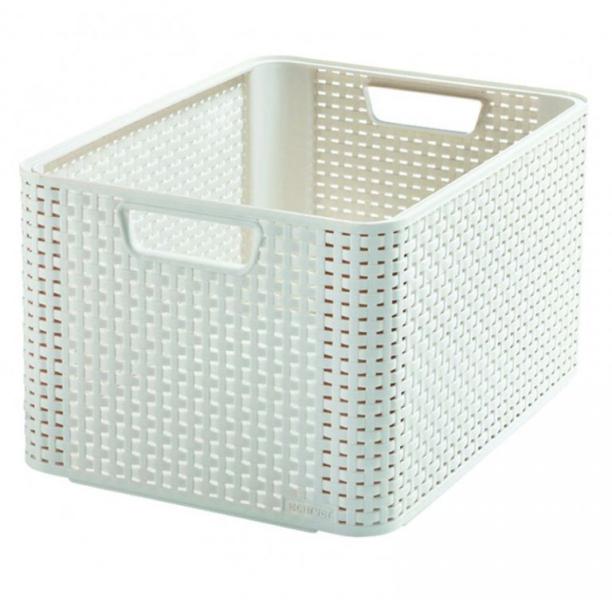 Műanyag tároló rattan kinézetű doboz Curver minőségi márkától. Egyszerű kezelhetőség közönhetően két szilárd fogantyúnak fonott részben, amely biztosítja a légárámlást. Doboz krémszínű és fedél nélkül van. Lehetőség dobozok egymásra rakása (teremt táróló rendszert) Techni kai adatok: vonzó design alkalmas ruhákra is méret: 43,6 x 22,8 x 32,6 cm anyag: poli