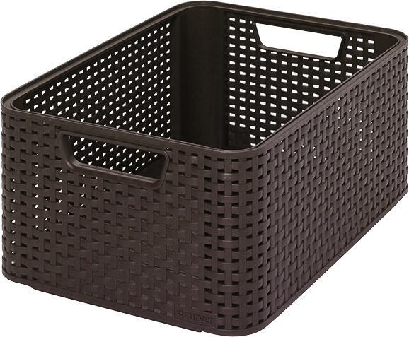 CURVER STYLE M méretű rattan kosár, sötétbarna 205844 (03615-210) A stílusos rattan kosár tökéletes alternatívája valódi, fonott rattan kosaraknak. A modern design illeszkedik a mind a hálószobába, mind pedig fürdőszobába és nappaliba is. Az anyag, amelyből a kosárból készült biztosítja, hogy a benne tárolt elemek nem sérülnek. Műszaki adatok: Méretek (szé x mé x ma