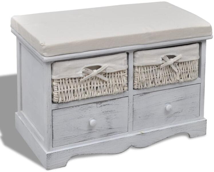 Ez a tárolópad kiváló minőségű fából készült, kialakítása letisztult, de ugyanakkor elegáns is. Nem csupán egy praktikus tárolóhely lesz, hanem otthonának dekoratív kiegészítője is egyben. Ez a tartós tárolópad két fonott kosárral és két fa fiókkal lett ellátva, így rengeteg helyet kínál dolgai tárolására, és ugyanakkor vidéki stílussal ruházza fel otthoná