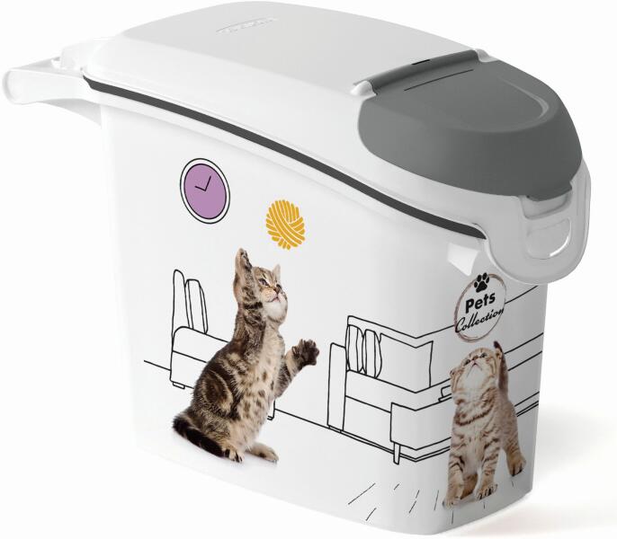 CURVER jutalomfalat tároló doboz 6kg/15L cicás 254863 (03883-E26) Magas minőségű műanyagból készült stílusos állateledel tároló, kedvence legnagyobb örömére. A termék tetején lévő fedélnek köszönhetően könnyedén tudja kiönteni a tárolóban lévő eledelt, kedvence számára. Mérgező anyagot NEM tartalmaz, így az állateledel semmilyen káros anyagot nem tud átvenni