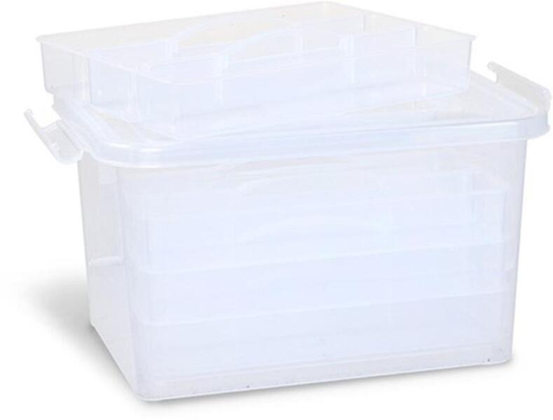 Tárolódoboz 25,5x17x14,5 cm méretben. Anyaga: műanyag4 db elválasztó tálcával.