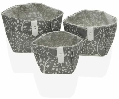 A tárolókosarak szürke-fehér mintás kivitelezése modern és letisztult megjelenést kölcsönöznek otthonunknak. Ráadásul a minta elegáns így hosszú távon is megfelelő megjelenést biztosít a helyiségnek. Minőségi anyagból készültek, így tartós és strapabíró felhasználást garantálnak. A kosarak Egyszerűen összecsukhatók, amikor nincsenek használatban, így praktiku