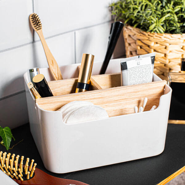 Stílusos és egyedi tároló fürdőszobába. Praktikus 5 rekeszes rendszerező doboz minőségi műanyagból, bambuszfa elválasztóval. Pipere, smink, fésűk, és egyéb fürdőszobai apróságok mutatósan tárolhatóak benne. A mindennapi eszközök így mindig kéznél lesznek. Mérete: 18x9,5x14,5 cm. Anyaga: műanyag, bambusz. Szín: fehér.