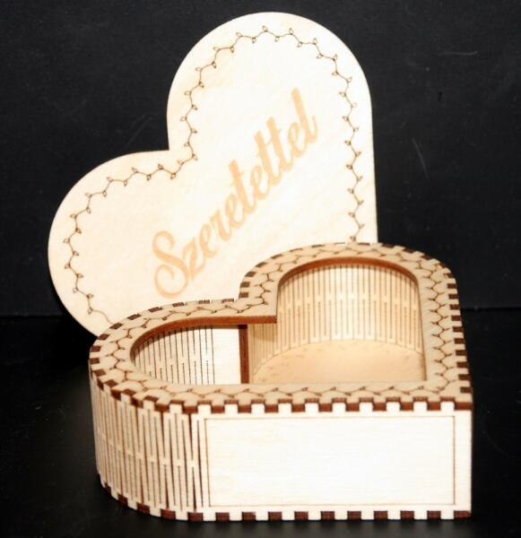 A Szív alakú ajándék doboz egy kiváló ajándék lehet születésnapokra, évfordulókra, Valentin napra vagy bármilyen alkalomra. A doboz anyaga 4mm vastag fa lemez, ami tartós és erős. A doboz méretei 13 x 12,5 x 4,5 cm, így elég nagy ahhoz, hogy elférjenek benne különböző ajándékok, édességek, vagy ékszerek. Igazán szép és elegáns megjelenést kölcsönöz az ajándék
