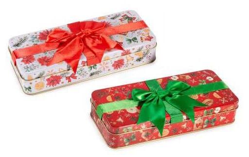 Ez a karácsonyi fémdoboz masni díszítéssel egy stílusos és praktikus választás, különösen bonbonok és más apró édességek tárolására, vagy ajándékok csomagolásához. A hosszúkás, lapos kialakításával könnyen elfér a konyhában vagy ajándékként is remekül mutat. Két változatban kapható: fehér mikulásvirágos mintával vagy piros harang mintával, mindkettő ün